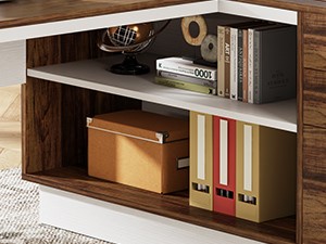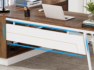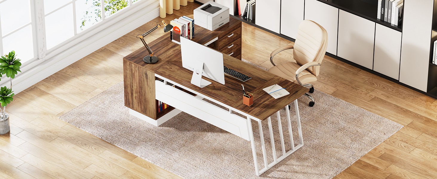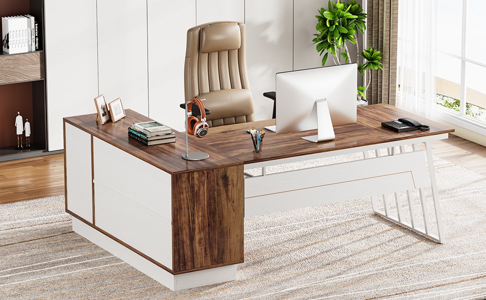This L-shaped executive desk features a spacious 71″ x 55″ surface, ample storage with drawers, shelves, and a file cabinet, and a sturdy metal frame supporting up to 350 lb. Made from high-grade MDF with a stylish white and walnut finish, it blends durability with modern industrial charm—perfect for any home office.